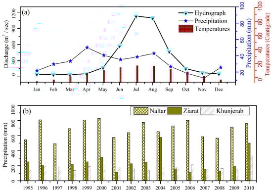 Figure 3. (a) Monthly average discharge (m3/s), total precipitation (mm), and average temperature (°C) data for Hunza River Basin during the 1966–2010 period. (b) Total annual precipitation recorded at the three meteorological stations (Naltar, Ziarat, and Khunjerab) in Hunza Basin during the 1995–2010 period.
