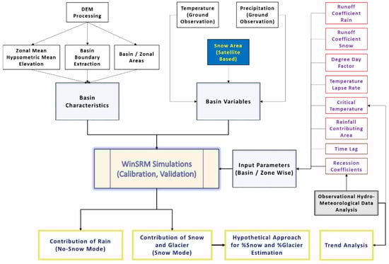 Meteorological data were analyzed to compute the variations in runoff components. The flowchart (Figure 5) shows the required basin variables, input model parameters, and meteorological data and their trend analysis.