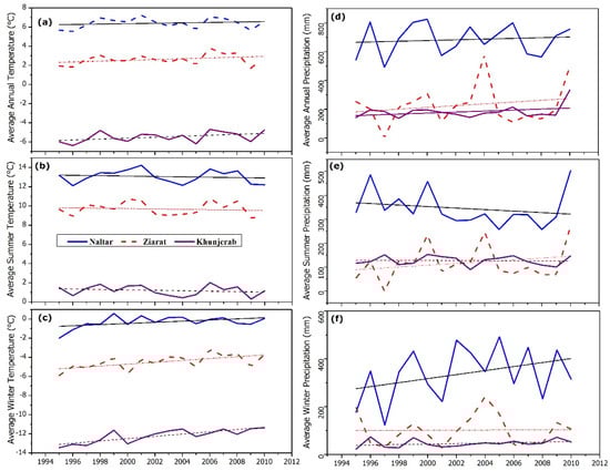 Figure 6. The left side shows annual, summer, and winter temperatures from top to bottom (ac), whereas the right side shows respective precipitation having the same pattern (df) during the 1995–2010 period from all three stations in the Hunza Basin. The blue solid line represents recordings at Naltar, the red dashed line at Ziarat, and the purple solid line at Khunjerab.