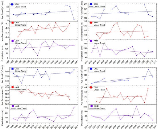 River runoff was on the rise in all four groups which can be explained in groups JFM, AMJ, and OND (with a rise in temperature supported by an occasional rise in precipitation) but group JAS is exceptional, where temperatures showed a declining trend (Figure 7). However, precipitation was rising in the same group and supports the rise in runoff. Average temperatures were highest in this group among all four groups, and the decreasing trend was 0.08 °C per year during the 1995–2010 period. It is important to mention that warmer rain water over the glacier surface can cause accelerated melting called rain-induced melting [77,78,79]. We believe that this would have happened in study area as well. Moreover, the Hunza basin is a very complex basin and there are chances of missing heavy rain events and temperature recordings in sub-basins where there are no observation stations. At times, the quality of recorded data also limited the explanation of such situations.