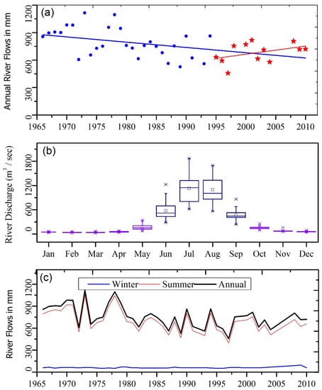 Figure 8. (a) Annual river flows during 1966 and 2010 (stars indicate annual flows during 1995 and 2010 only) with linear trends. (b) Box plot of monthly flows during 1966 and 2010, dominated by flows in July and August followed by June and September. (c) Winter flows were very low, whereas summer and annual flows followed the same pattern which means annual flows are governed by summer flows.