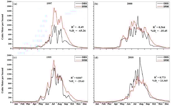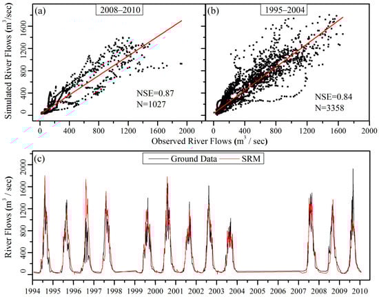 The results of the SRM simulations for 1995–2010 are shown in Table 3 and Figure 9a–c. The Nash–Sutcliffe Efficiency (NSE) values show that the SRM performed effectively for most of the years with two exceptions, 1997 and 2000, where the model performed poorly (Figure 9a,b), as indicated by the values for NSE (−0.49, 0.564) and %Dv (−65.26%, −35.45%). The black line (Figure 9c) represents the observed river discharge data and the red line represents the SRM simulations. The model accurately simulated the low and high flows (Figure 9c), as confirmed by the accuracy assessment for the validation years shown in Figure 9b and for the calibration years in Figure 9a, with encouraging NSE values.