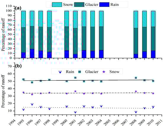 Figure 11. Annual variations in runoff components between 1995 and 2010. (a): stacked percent snow, glacier melt runoff along with percent rainfall runoff of the respective years, (b): percent runoff components of the respective years.
