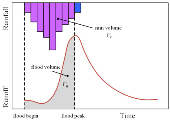 Schematic diagram of the rainfall–runoff process. and are the rainfall volume and runoff volume for the period before flood peak, respectively.