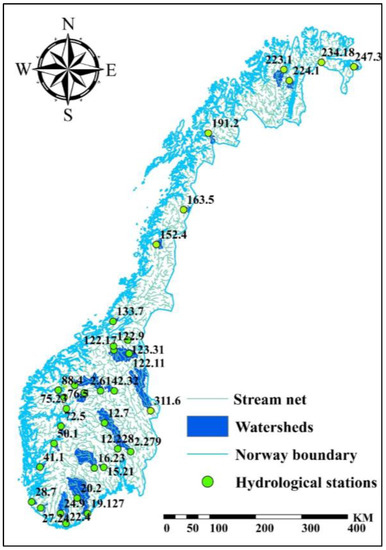 The temperature, precipitation and runoff data of 34 stations in Norway used in this study are all provided by Norwegian Water Resources and Energy Agency (NVE) (Table 1 and Figure 2), and the river network and watersheds of these 34 hydrological stations are shown in Figure 2. The stations with missing measurements in these three types of observation data were discarded. Finally, 12 stations with different FGMs were selected for further study. From the perspective of geographical location, six stations are located in coastal areas, and the rest are located in internal areas.