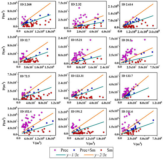 As shown in Figure 3, the scatter diagram of rainfall (subtracting evaporation) and flood volume (V) was drawn. Based on the 1/3 V and 2/3 V lines, the 12 selected stations can be clearly divided into three FGMs, namely storm-induced flood, rain-on-snow-induced flood and snowmelt-induced flood, based on the rainfall–flood ratio. Moreover, we can also intuitively see which FGM plays a dominate role in a basin. Among them, floods of seven basins are mainly controlled by storm floods and snowmelt floods, and have less rain-on-snow floods. Interestingly, floods in two basins, Kjeldstad and Nybergsund (ID: 123.31, 311.6), are jointly controlled by all of the three FGMs. The floods of the remaining three basins are dominated by both rain-on-snow floods and one of the other two FGMs. The flood division results show that floods in western coastal areas mainly occur in autumn/winter with heavy rainfall, and a few are caused by snowmelt. In addition, it can be found that most of the selected 12 hydrological stations are dominated by one or two of the three FGMs, which is similar to the previous results of flood classification in Norway [3].