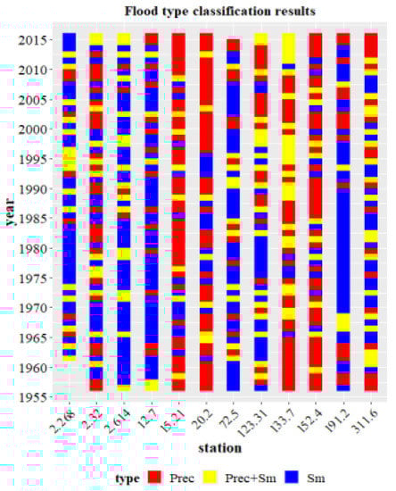 In addition, the identified FGM for each year of the selected 12 stations is shown in Figure 4, which is helpful to see the transition among different FGMs under a changing environment. For example, for station 191.2, there used to be many snowmelt floods before 1990s, but there have been more rainfall-induced floods in recent decades. Additionally, for station 133.7, there are more rain-on-snow flood events in recent decades than previously.