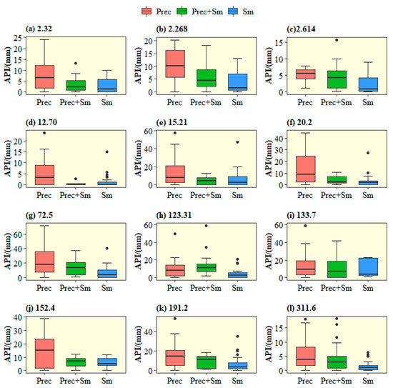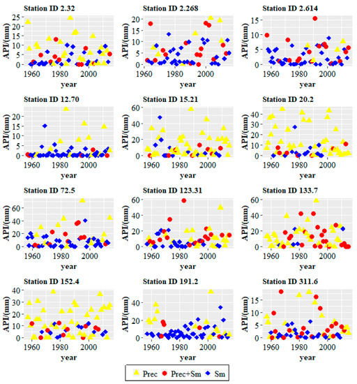 where, is the regression coefficient; is the time when API is estimated. is the lag time, which can be taken as 1 day, 3 days, 7 days, 15 days and 30 days; stands for rainfall. In practical applications, researchers often use the combination of and , but it is likely that it is not the most suitable one [49]. Froidevaux et al. [50] proposed the use of regression coefficient when finding the most suitable delay days of flood trigger in Switzerland. It should be mentioned that longer lag time is suggested for a larger basin and shorter one for a smaller basin. Woldemeskel et al. [51] suggested the use of lag time ranging from 1 to 7 days and regression coefficient k ranging from 0.4 to 1. Following this suggestion, we adopted 0.8 and 7 days in this study for the regression coefficient and lag time, respectively. The estimation of API is useful for analyzing the relationship between the classified flood types and soil moisture.