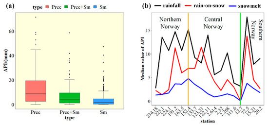 To bring out the physical meaning of the classified FGMs and check the accuracy of our classification of FGMs, we examined the relationship between each FGM and soil moisture, similar to Hundecha et al. [21]. However, due to the scarcity of soil moisture data, API is used as a proxy of soil moisture in this study. According to the scatter diagram of API values of the three FGMs (Figure 5) and box-plot diagram (Figure 6), it can be seen that the median value of API of rainfall-induced flood is the largest, the median value of API of the identified snowmelt-induced floods is smallest, and the median value of API of rain-on-snow-induced flood lies between them. Moreover, in order to reduce the error caused by short flood series, the average API of each FGM of all 12 selected stations is also analyzed (Figure 7a), and we can obtain the same results. Generally, the above findings are consistent with the formation mechanism of each FGM, and thus further demonstrate the rationality of our classification. In addition, if we arrange the order of all the 34 hydrological stations of Norway according to their geographical spatial location from north to south, we can see that the API median of rain-on-snow floods lies between the rainfall floods and snowmelt floods. Interestingly, we found that the API medians of different FGMs have obvious geographical differences. The API medians are high in northern Norway and decrease in central Norway, and the largest values are typically in Southern Norway (Figure 7b).