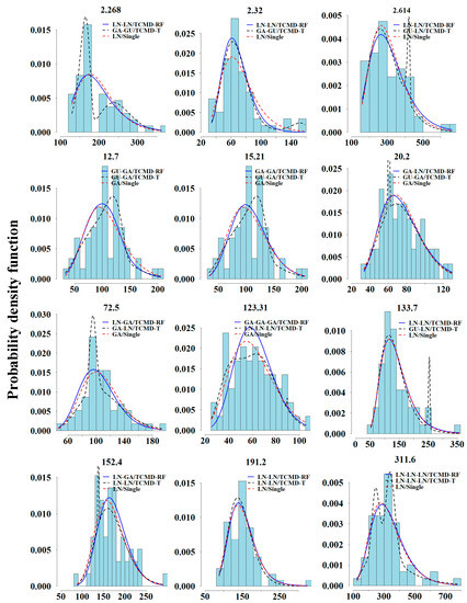 Once we have classified the flood events into distinct FGMs, we are able to build the mixture distributions and select an appropriate component distribution for each FGM, thus fulfilling the IID assumption for flood population from each FGM. In recent years, there have been several studies which have attempted to strengthen the physical meaning of mixture distributions using the divided flood samples. Li et al. [27] and Zeng et al. [28] divided the whole annual maximum flood series into two sub-series using the detected change point, and highlighted the superiority of the developed TCMD of Pearson distribution with prior classification. Fischer et al. [7] constructed seasonal mixture distributions to model the winter and summer floods, and, particularly, the summer floods were further divided into long-duration and short-duration floods based on the FT index. Yan et al. [3] divided the flood events in Norway into long-duration flood events and short-duration flood events using the FT index, and constructed the TCMDs, whose weighting coefficients are determined by the ratio of each flood type in the whole flood series.