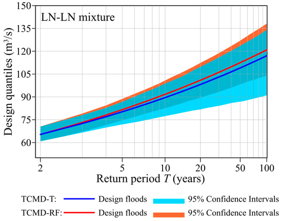 - Although the performance of TCMD-RF model is not as good as TCMD-T model, TCMD-RF can reduce the uncertainties of design flood quantiles by about 20%. The advantage of TCMD-RF model can be attributed to its clear classification of flood types; thus, the weighting coefficients of mixture distributions can be determined before the optimization.
