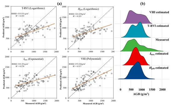 Figure 7a shows the scatter plot of the predicted and the measured AGB of the optimal models from different input variables, and Figure 7b is the corresponding ridgeline plot. The scatter plots show that the four variables were prone to overestimate in the low AGB values and underestimate in the high AGB values. The results of Hp50 and Imax were the most significant, and the prediction results of VHI alleviated this problem. From the ridgeline plot, it can be seen that the AGB prediction values of Hp50 and Imax were concentrated in the range of 600–800 g/m2, and the T-RVI prediction values had two distribution peaks at about 600 and 900 g/m2. The distribution of the predicted values of VHI was the closest to those measured in the field, but the underestimation was still significant for the quadrats above 1500 g/m2.