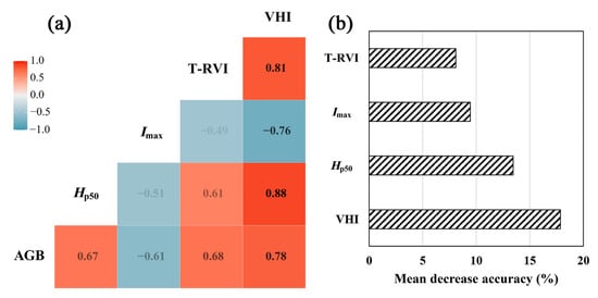 The mutual correlation analysis results are shown in Figure 8a. Compared with the optimal VI, height metric, and intensity metric, the correlation between VHI and AGB reached more than 0.78, significantly higher than the three sub-indicators. The correlation coefficient among the three sub-indicators was relatively low, with the highest correlation coefficient of 0.61 between T-RVI and Hp50, while the average correlation coefficient between VHI and the three sub-indicators reached 0.82. Figure 8b shows the importance ranking of VHI and the optimal VI, height metric, and intensity metric in the RF model. VHI was the most important variable in the RF model. When VHI was randomly disturbed, the out-of-bag error was the largest, which reached 18.95%. The importance of Hp50 and Imax was lower, and T-RVI was the least important in the RF model. The above results show that VHI can comprehensively represent the three sub-indicators and has higher importance in the AGB retrieval model.