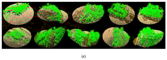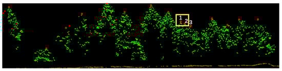 (3) If many trees are growing close together, the segmentation results as well as the classification of tree species will be affected. In this survey area, if pines or birches grow together, they are easily identified as cedars, because the segmentation algorithm easily classifies the trees’ points next to each other equally, which makes the triangular shape become a rectangular section structure.
