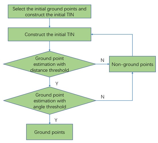 Point cloud filtering is the process of separating ground points and non-ground points in the airborne LiDAR point cloud data. The obtained ground points can generate a DEM. Triangulated Irregular Network progressive adaptive filtering algorithm is a universal algorithm which was first proposed by Axelsson [59]. As the Figure 3 shows, the algorithm first selects the initial seed point to construct an initial TIN, and then gradually judges and adds other points to the ground points. The criteria are the angle and vertical distance from this point to the original triangular plane. When the angle and vertical distance are both less than the set thresholds, the point is classified as a ground point. The specific steps of the algorithm are as follows: