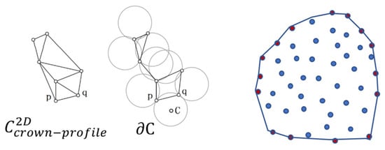 - The tree crowns points can be projected onto the plane of the profile plane, and in that way, the 3D points can be transferred to 2D points , then a series of excellent algorithms can be used, such as the alpha shapes algorithm [60] which is one of the best algorithms to get the shape of the point set δC as the Figure 12 shows. In addition, the user can also control the shape δC of set by adjusting the unique parameter α of the algorithm.