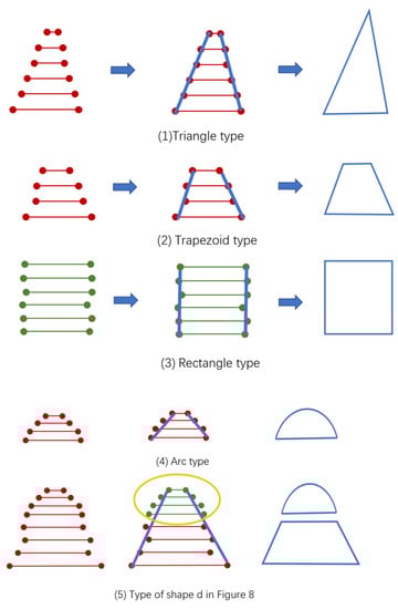 From the Figure 9 and Figure 10, the tree crown can be simplified into a combination of basic shapes such as sectors, isosceles triangles, and rectangles. In other words, all the crown shapes can be fitted to combinations of basic shapes from the key points of the tree crowns.