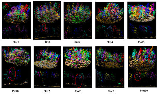 The high vegetation points, which are not segmented, are assigned to the corresponding tree point group with the shortest distance to the central axis of the tree, and the final tree crown segmentation is complete. The segmentation results are closely related to the grid size and the elevation threshold of the template calculation. If the values are too low, the calculation amount will increase. Otherwise, if the values are set too high, the trees will be missed. The optimal value is related to the point cloud density, tree crown size, and shapes.