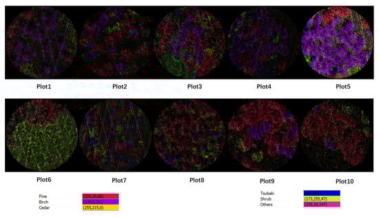 From Figure 1, sample plots of diameters of 30 m were set up in the survey area of Northeast Hupao National Park, which mainly includes five types of trees, including Pine, Birch, Cedar, Tsubaki, and Shrub. Then, ten sample plots were selected to test the algorithm, which contains various origins, terrains, and slope directions that meet the test requirements of DTM acquisition, tree crown segmentation, tree location, and finally, tree species classification.