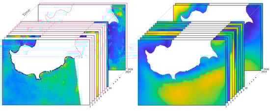 Data consist of image time series from UERRA-HARMONIE [34] regional reanalysis and Sentinel-1 SAR Level-2 OCN datasets [35], which were initially made available at the spatial resolutions of 11 km and 1 km, respectively. As both datasets originally come as gridded products, the study area is discretized into 132 × 242 cells of 0.009° (~1 km), matching the spatial resolution of the finest-scale product (Sentinel-1). Onshore (land) areas of Cyprus where SAR wind retrievals are not available are masked-out. The sample period for both datasets extends from 1 June 2017 to 31 May 2019, encompassing two (2) full season cycles. A visual depiction of the image time series derived from the two data sources is provided in Figure 2.