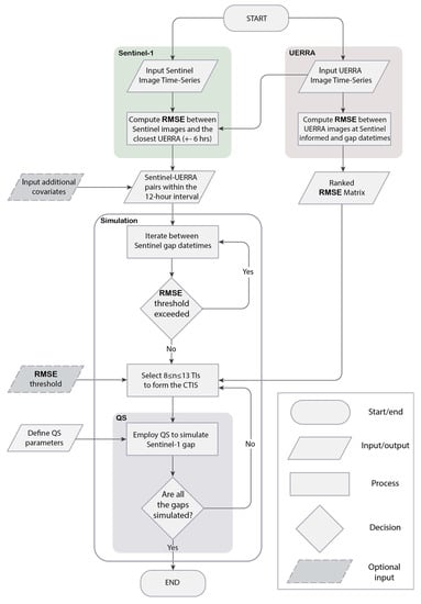 Despite the threshold set, the number of TIs cannot go below 8 or exceed 13. This range was also determined via trial and error and may vary in different applications depending, among other factors, on the multivariate relationship between the selected variables. Here, having either a lower or higher number of TIs than the aforementioned thresholds can lead to misrepresentation of the fine-scale wind speed patterns to be simulated. Moreover, using a high number of TIs to simulate a single image could significantly increase the computation time without providing added value in terms of the realistic reconstruction of the non-stationary wind fields. If no representative UERRA image can be identified to be used in the CTIS, the gap is not simulated. Once the CTIS has been defined and QS parameters have been set as described in Section 3.3, fine-scale offshore wind speed images are simulated in sequence until all Sentinel-1 image time-series gaps have been filled. Figure 4 provides a step-by-step schematic workflow of the proposed methodological framework.