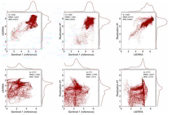 The scatterplots and marginal distributions presented in Figure 7 are used to compare the reference and simulated fields, as well as the UERRA auxiliary variable at the same datetimes. The two rows of subfigures refer to the wind speed values derived from the images of the examples presented above. A linear relationship is quite evident in the first example, in which all three variables seem to be pairwise-correlated. In the second example, however, there is no linear correlation between UERRA and the two fine-scale images, and the simulated realization seems to generally overestimate the reference field. This is also confirmed by the accompanying statistics (RMSE and MAE) computed between each pair of wind speed images. Furthermore, the deviation largely originates from the high number of zero (0)-wind-speed values only apparent in the Sentinel-1 image, the existence of which should be further investigated, as they commonly appear in many reference images. A slight overestimation of the reference wind speed values by the realization is evident in both examples, which is also explained by the higher UERRA wind speed values compared to the reference image. It should be noted that points depicted in the scatterplots between the realization and the reference images (second column) are not expected to be aligned on a 1:1 basis, as no reference conditioning data are available. It is anticipated, however, that the correlation (dependence) between UERRA and reference images (first column) is adequately reproduced in the realizations (third column).