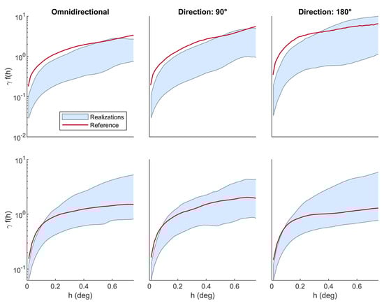 Figure 8. Experimental omnidirectional and directional (along 90° and 180° directions) variograms for the reference and 5%–95% envelope of 50 realizations on 10 June 2017 (first row) and 15 June 2017 (second row).