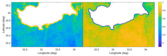 Kullback–Leibler divergence and Perkins skill score plots (Figure 9) also indicate an overall convergence between the reference and simulation distributions. Both metrics were computed over the full reference and simulation image time series (461 images). The highest KL values (and lowest PSS values) are observed around the northeast edge of the study area, where pattern matches are limited by the spatially discontinuous subdomain due to Cyprus mainland and edge effects. Moreover, the substantial number of missing values close to the coast (discarded due to low-quality flag values) does not allow for an efficient reconstruction. Conversely, the highest number of Sentinel-1 nodes is within the area enclosed by the sharp edges evident in the east of the study area. There, both metrics indicate a better agreement between the two distributions in comparison to the rest of the domain, indicating the potential for the reconstruction of longer time series as more Sentinel-1-informed images become available.