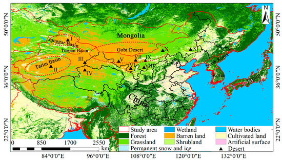 East Asia (4°N–53°N, 73°E–150°E) borders the west coast of the Pacific Ocean and includes China, Japan, South Korea, North Korea, and Mongolia (Figure 1). Most inland areas in the west are plateaus and mountains, whereas the eastern coast generally comprises plains and hills. It is one of the regions with the most typical monsoon climate globally. The eastern region has a temperate and subtropical monsoon climate with wet and warm summers and cold and dry winters. However, the western region is located in the interior of the Eurasian continent and belongs to the semi-arid and arid climate zone. Owing to the distance from the ocean, ocean water vapor is limited, precipitation is low, and the annual range is large. Figure 1 shows the types of land cover in East Asia, which were extracted from China’s environmental disaster monitoring and forecasting small satellite (HJ-1A/B), China’s high-resolution earth observation system satellite 1 (GF-1), and Landsat satellite images [31]. The main land cover in northwest China and southern Mongolia is barren land, i.e., land with low vegetation cover, including desert, sand, gravel, bare rock, and saline and alkaline land.