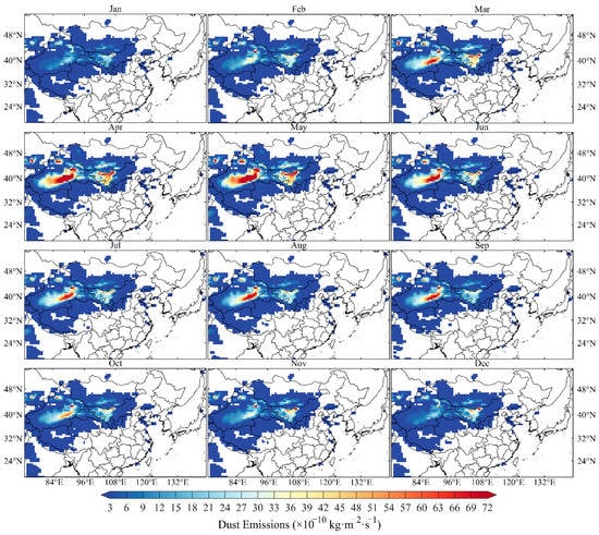 Modern-Era Retrospective Analysis for Research and Applications version 2 (MERRA-2) is a satellite-era global atmospheric reanalysis product provided by the National Aeronautics and Space Administration (NASA) Global Modeling and Assimilation Office. The MERRA-2 datasets were produced by the Goddard Earth Observing System (GEOS) data assimilation system, which is based on the GEOS-5 climate model and the Gridpoint Statistical Interpolation analysis scheme [32,33]. The monthly dust emission data used in this study were from the “tavgM_2d_adg_Nx” dataset, with a spatial resolution of 0.625° × 0.5° (https://disc.gsfc.nasa.gov/) (accessed on 20 June 2022). Dust emissions are wind-driven for five size bins, namely bin001, bin002, bin003, bin004, and bin005, with particle radii of 0.1–1, 1–1.8, 1.8–3, 3–6, and 6–10 μm, respectively [34,35]. Dust emission simulations relied on a map of potential dust source locations based on the observed correlation of dust emitting regions with large-scale topographic depressions [36]. Dust emissions near dust-affected areas correlated best with observations [35]. The following formula was used to calculate dust emissions: