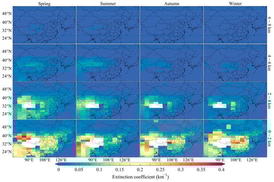 Dust, which is emitted into the atmosphere, is a very common type of atmospheric aerosol in the troposphere, and its vertical movement plays a unique role in global climate change [1,4]. Therefore, it is imperative to study the vertical distribution of airborne dust particles. The CALIPSO satellite is the most efficient tool for studying the vertical distribution properties of airborne dust particles. The distribution of the average extinction coefficient of dust aerosols in different seasons and at different heights in East Asia from 2006 to 2021 is shown in Figure 3.