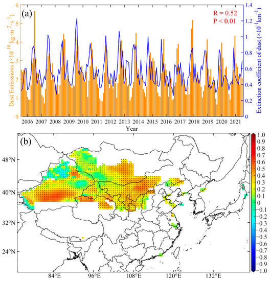 Variation (a) and spatial distribution of correlation (b) between MERRA-2 dust emissions and CALIPSO-observed dust extinction coefficient (0–4 km) in East Asia from 2006 to 2021 (·indicates over 90% confidence).