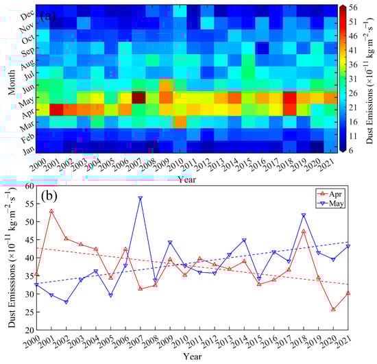 Figure 5a shows the interannual variation in monthly dust emissions in East Asia. As analyzed previously, dust emissions were significantly higher from March to June compared to other months and were particularly high from April to May, with a progressively declining trend following this period. The intensity of dust activities was lowest from December of the previous year to February of the following year. Additionally, 2007 showed a turning point for dust emission changes in April and May (Figure 5b). April was usually the month with the highest dust emissions each year from 2000 to 2006. However, annual dust emissions in May from 2007 to 2021 were generally higher than those in April. Dust emissions in May 2007 were the highest in East Asia since the start of the 21st century, at approximately 56 × 10−11 kg·m−2·s−1.