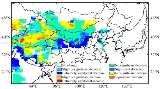 Theil–Sen median trend analysis and the Mann–Kendall test can effectively characterize the variation trend in each pixel to reflect the spatial distribution characteristics of the variation trend in East Asian dust emissions. First, the values of β (Theil–Sen median) can be divided into three cases, namely β > 0, β < 0, and β = 0, indicating an upward trend, downward trend, and no change, respectively. Second, at significance levels of α = 0.1, 0.05, and 0.01, the significance test results of the Mann–Kendall test are classified as follows: extremely significant variation (2.576 ≤ |Z|), significant variation (1.96 ≤ |Z| < 2.576), slightly significant variation (1.645 ≤ |Z| < 1.96), and no significant variation (|Z| < 1.645). Integrating Theil–Sen media trend analysis and Mann–Kendall significance test results, the interannual variation trends in dust emissions are divided into nine categories. The method for judging the significance of the trend is shown in Table 1.