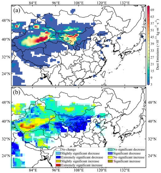 Spatial distribution of (a) average dust emissions and (b) interannual trends in East Asia in spring from 2000 to 2021.