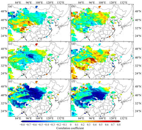 Correlations between East Asian dust emissions in spring and the (a) ENSO, (b) SO, (c) AAO, (d) PNA pattern, (e) AO, and (f) NAO indices in winter from 2000 to 2021. Black dots indicate a confidence level above 90%.