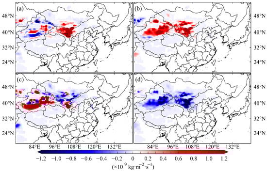 Figure 9 shows the variation characteristics of dust emissions in the spring following the winter AO−/NAO−, AO−/NAO+, AO+/NAO−, and AO+/NAO+ years. In the winter of AO−/NAO− coupled years (Figure 7a), dust emissions increased abnormally in the GD of southern Mongolia and western IM and the central and eastern TB (Figure 9a); however, dust emissions in the southern TB and JB showed an abnormal decrease. In AO−/NAO+ coupled years, the main dust discharge areas in East Asia showed an abnormally increasing trend (Figure 9b). In the winter of the AO+/NAO− year, the dust emissions in southern Mongolia and most parts of western IM showed an abnormal decreasing trend in spring (Figure 9c). However, the TD in southwest IM showed an unusual increase in emissions. Similarly, the dust emissions in the JB and TB showed an abnormal growth trend. When the northern hemisphere’s winter was in an AO+/NAO+ coupling year, dust emissions were abnormally low in the following spring (Figure 9d), opposite to AO−/NAO+ coupling years.