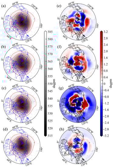 Spatial distribution of (a–d) mean spring 500 hPa geopotential height and (e–h) anomalies in (a,e) AO−/NAO−, (b,f) AO−/NAO+, (c,g) AO+/NAO−, and (d,h) AO+/NAO+ years.
