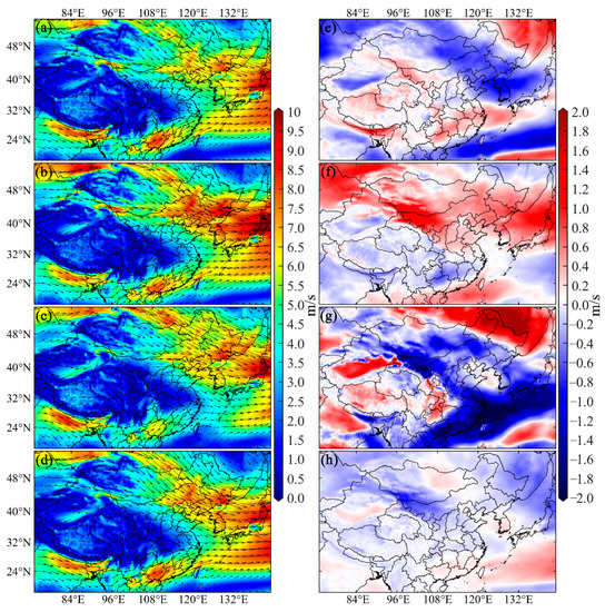 Spatial distribution of (a–d) mean spring 800 hPa wind speed and (e–h) anomalies in (a,e) AO−/NAO−, (b,f) AO−/NAO+, (c,g) AO+/NAO−, and (d,h) AO+/NAO+ years.