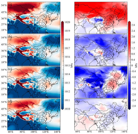 Spatial distribution of (a–d) mean spring sea level pressure and (e–h) anomalies in (a,e) AO−/NAO−, (b,f) AO−/NAO+, (c,g) AO+/NAO−, and (d,h) AO+/NAO+ years.