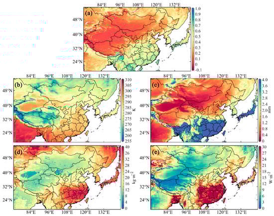 The average spring vegetation cover (a), land surface temperature (b), precipitation (c), soil moisture (d), and soil evaporation flux (e) in East Asia from 2000 to 2021.