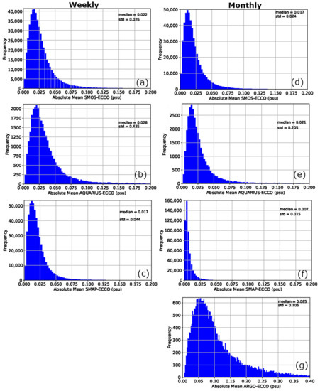 We now compare the global sampling error of each product. Figure 5 shows the histograms of the sampling error globally over the 1-year time period at weekly (when available) and monthly time scales, i.e., histograms of the fields depicted in Figure 3a,c,e and Figure 4a,c,e,g. As pointed out earlier, the standard deviations of the distributions are larger at weekly time scales (from 0.026 (SMOS) to 0.435 (Aquarius) psu) than monthly time scales (from 0.015 (SMAP) to 0.205 (Aquarius) psu). The standard deviation of the weekly distributions of SMAP and Aquarius differences with ECCO are higher than that of SMOS (Figure 5) as outliers impact the standard deviation values. While the range of the differences between SMOS and ECCO at weekly time scales is about 5.3 psu, the range of the differences between SMAP and ECCO reaches 9.5 psu and the range of the differences between Aquarius and ECCO reaches 11 psu. We thus decided to use the interquartile range (IQR) that is another way to measure the spread of values in a dataset [34]. However, unlike the standard deviation, the IQR is not affected by extreme outliers and is thus more appropriate in our case. The IQR of the weekly distribution of the differences between SMAP and ECCO is slightly lower than that of SMOS (0.016 psu versus 0.020 psu) and the IQR of the weekly distribution of the differences between Aquarius and ECCO is also similar, about 0.027 psu. Regarding the monthly distributions, the IQR for SMAP (0.006 psu) is lower than that of SMOS (0.029 psu) and of Aquarius (0.02 psu). Finally, the IQR of the difference between in situ and ECCO is about 0.09 psu, significantly higher than for all the satellite products.