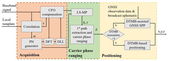 29], which regarded TPSs as the frequency-domain pilots. Simulation results showed that a positioning accuracy within 1 m can be achieved in single-frequency network scenarios with the time–frequency scheme. However, that method has to demodulate the signal and require the transmitters to be synchronized. Normally, there are only one or two transmitters nearby, which are insufficient to derive a position fix for the receiver by DTMB alone. On one hand, the DTMB signal was combined with other sensors to obtain position results. The DTMB signals can be combined with a pedestrian dead reckoning system [