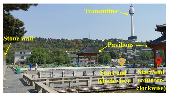 Figure 3. For each static test, 60 s data was collected. For each dynamic test, the trajectory was walked twice under each channel with one clockwise and one counter-clockwise. The test data collected in Lianhua Lake park, Wuhan, were also used to verify the proposed DTMB-assisted GNSS positioning method. The surroundings of this walking route are shown in