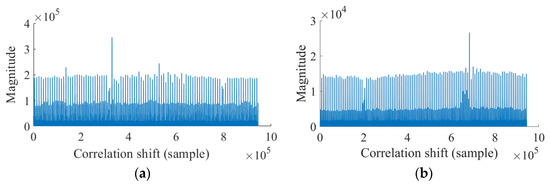 In our tests, K = 10 was used in Equation (9), and the search region was expanded to [−10, 10] samples to guarantee that the first path falls into this region. In addition, the threshold value was taken as , which means the multipath component should at least have a magnitude of 0.1 of the first path.