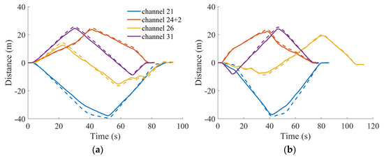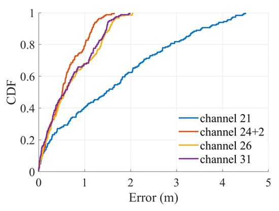 Figure 10, where the maximum ranging error is below 2.2 m for channel 24+2, 26, and 31. A large error occurred in channel 21 because of the deviation in 20~60 s in