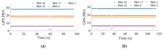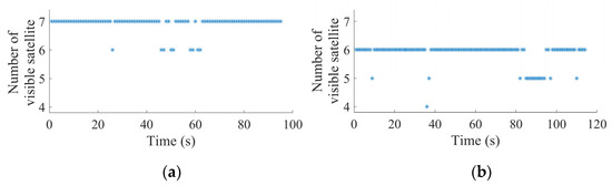 The GPS signal was collected in this paper as an example to show the positioning accuracy improvement that the DTMB can make to assist GNSS. For other GNSS constellations, the proposed positioning method can be easily applied without modification. The data output from GPS and u-blox are GPS timestamped, while the data output from USRP is UTC timestamped, so they can be easily aligned. At the beginning of each dynamic test, there was a standstill period of about 10 s for GPS to obtain its initial position, which is then used to find the initial geometric distance between the receiver and the DTMB transmitter. Since the GPS pseudorange observation output rate from u-blox is 1 Hz, the rate of SPP is 1 Hz as well. Only the satellites with an elevation bigger than 15° are used for positioning, and the number of visible satellites is shown in