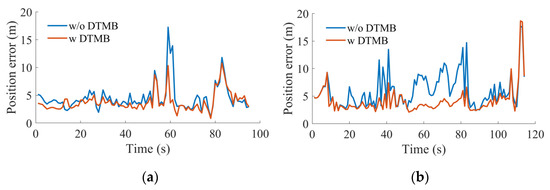 Figure 12. For the clockwise walking test, the mean position errors decreased from 4.54 m to 3.85 m with the help of DTMB signals. For the counter-clockwise walking test, the mean position errors decreased from 6.02 m to 4.15 m. Since the start point of the counter-clockwise test was near the big pavilion, the GPS signal that came from the south side was attenuated, the initial signal receiving condition was poorer than the clockwise test, and there is one satellite less in the counter-clockwise test. Thus, the position error is larger than the clockwise one. In addition, there are large errors occurred at the end of the counter-clockwise test as we walked in the big pavilion and stopped. Consequently, the DTMB-assisted SPP offered larger improvement in the counter-clockwise test than the clockwise test.