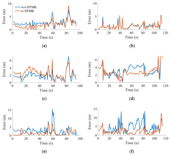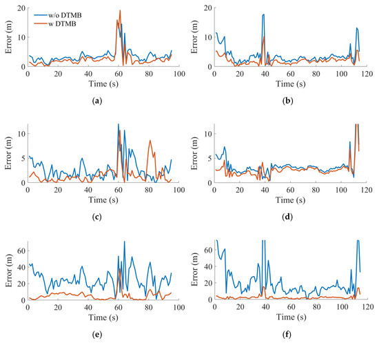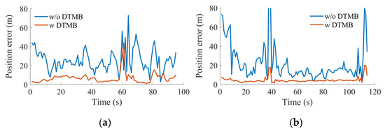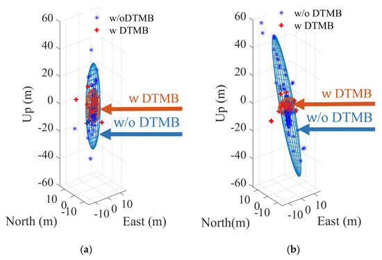 Figure 20, where improvements occurred in every direction, especially in the up direction with the help of DTMB signals. Since the elevation of most GPS satellites used in this scenario are larger than 45°, the vertical position accuracy is poor, resulting in large position errors in the up direction in