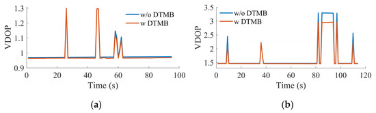 Figure 15, where a reduction can be observed in both tests with the help of DTMB signals. The fluctuations in VDOP results are related to the variation of the number of visible satellites. In addition, the mean value decreased from 0.99 to 0.98 in the clockwise test, and from 1.69 to 1.64 in the counter-clockwise test. This explains why larger improvements occurred in the vertical direction, since a smaller VDOP means a higher vertical positioning accuracy. Moreover, the VDOP is smaller in the clockwise test because there are more visible satellites in the clockwise test than the counter-clockwise test. Thus, the DTMB-assisted GPS SPP achieved higher VDOP improvement in the counter-clockwise test compared with the clockwise test.